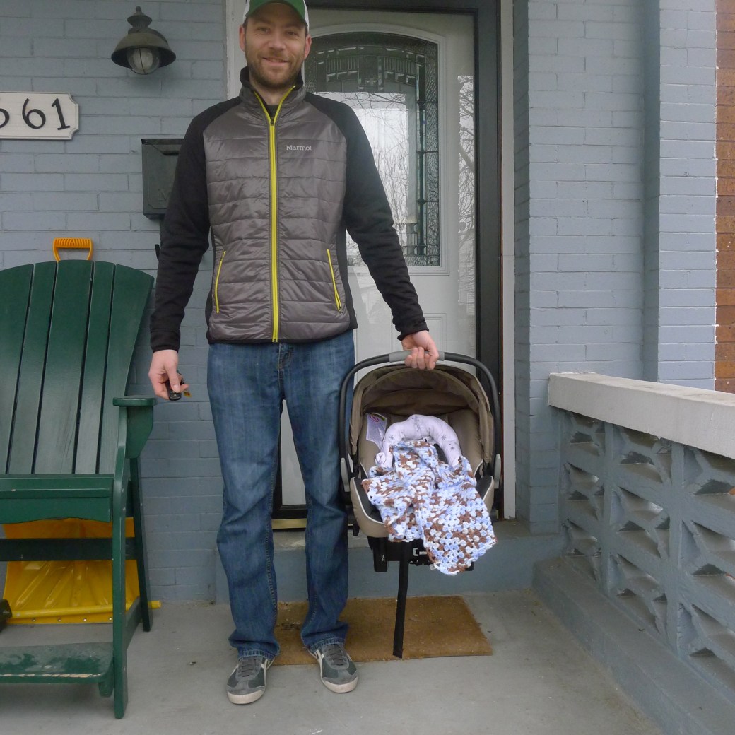 Heading to the doc Published March 21, 2013 at 2736 × 2736 in Week 1: Finn’s Story Next → Ryan proudly taking Finn for his first adventure to the pediatrician – we even got snow in March to mark the day!